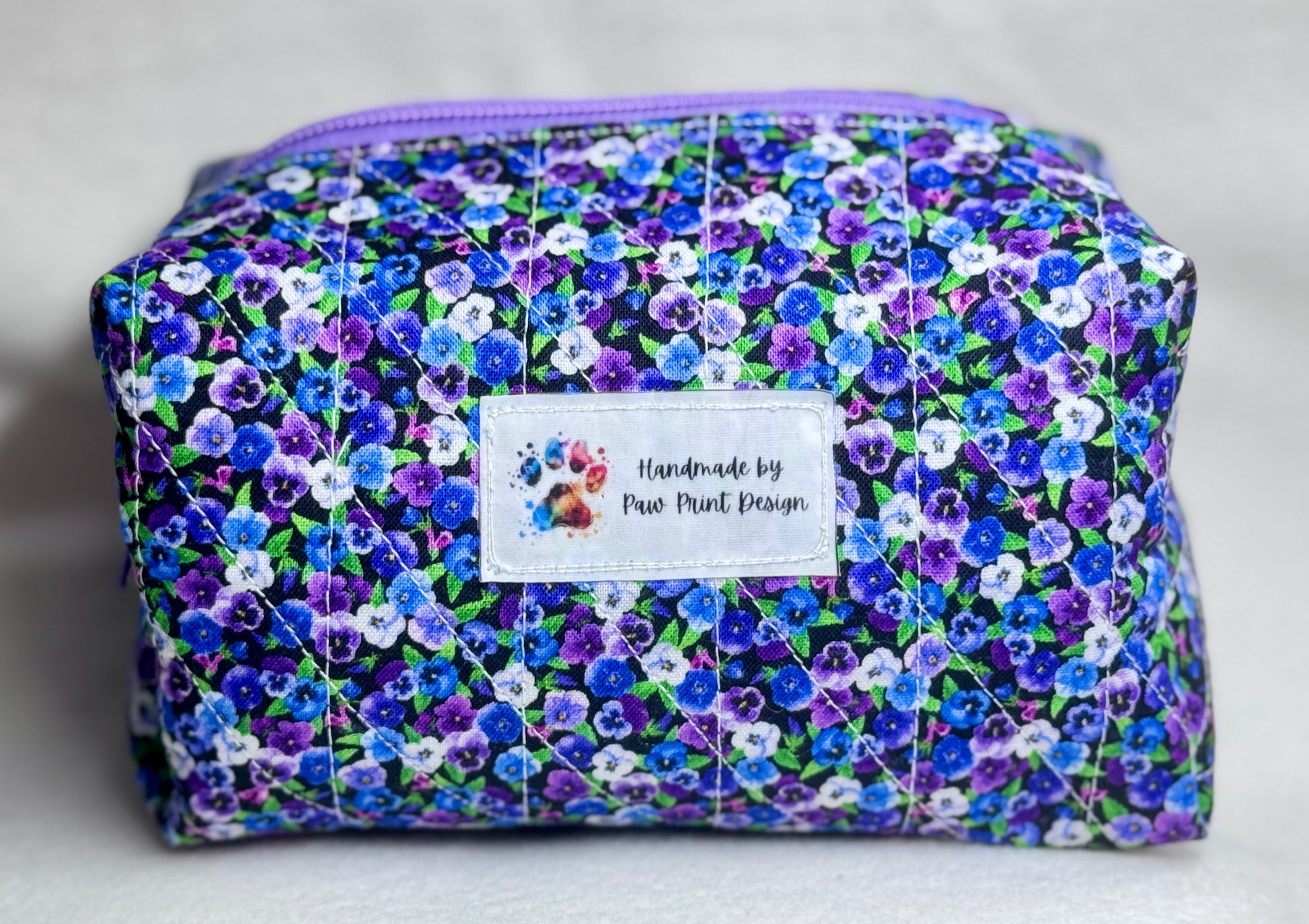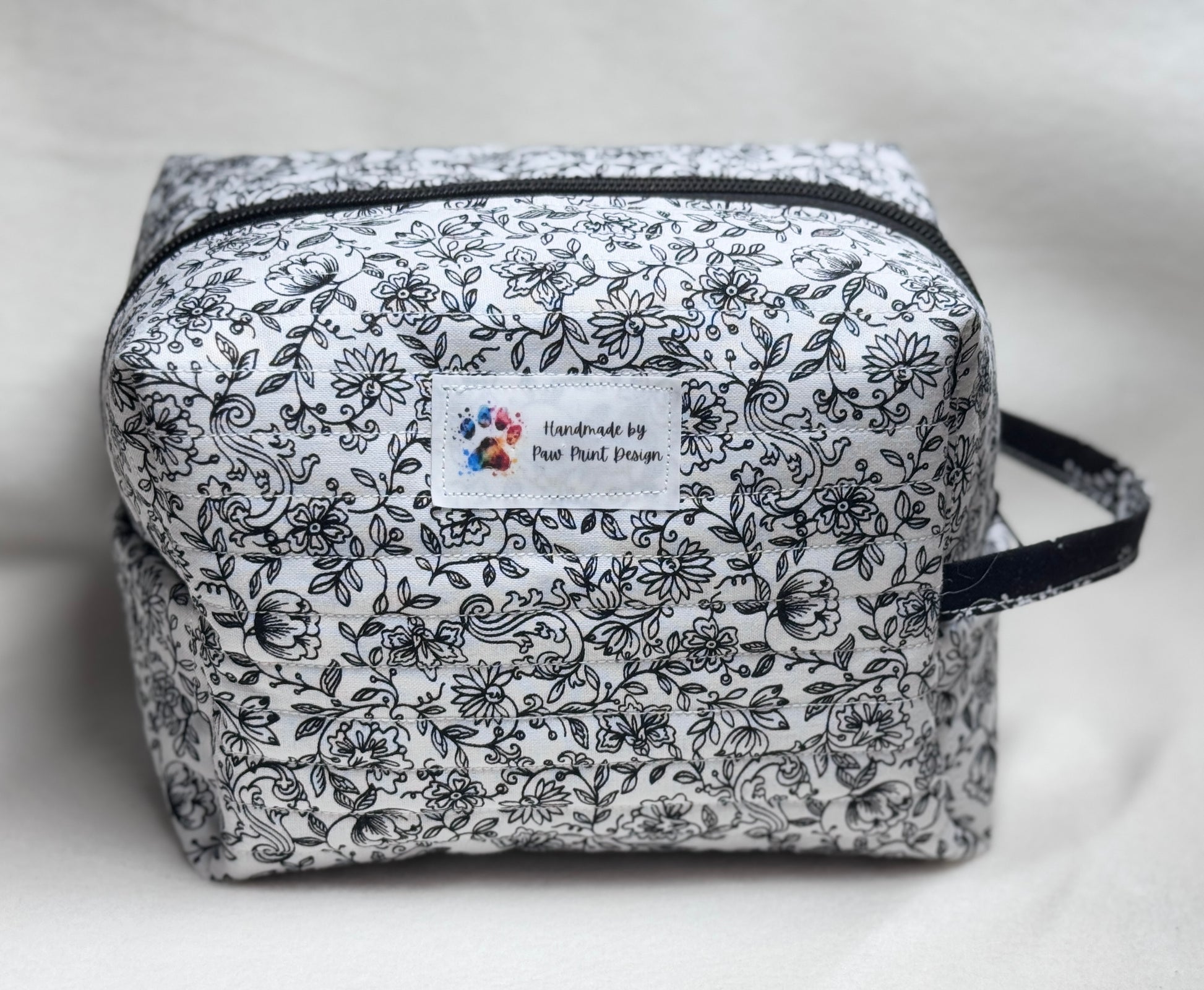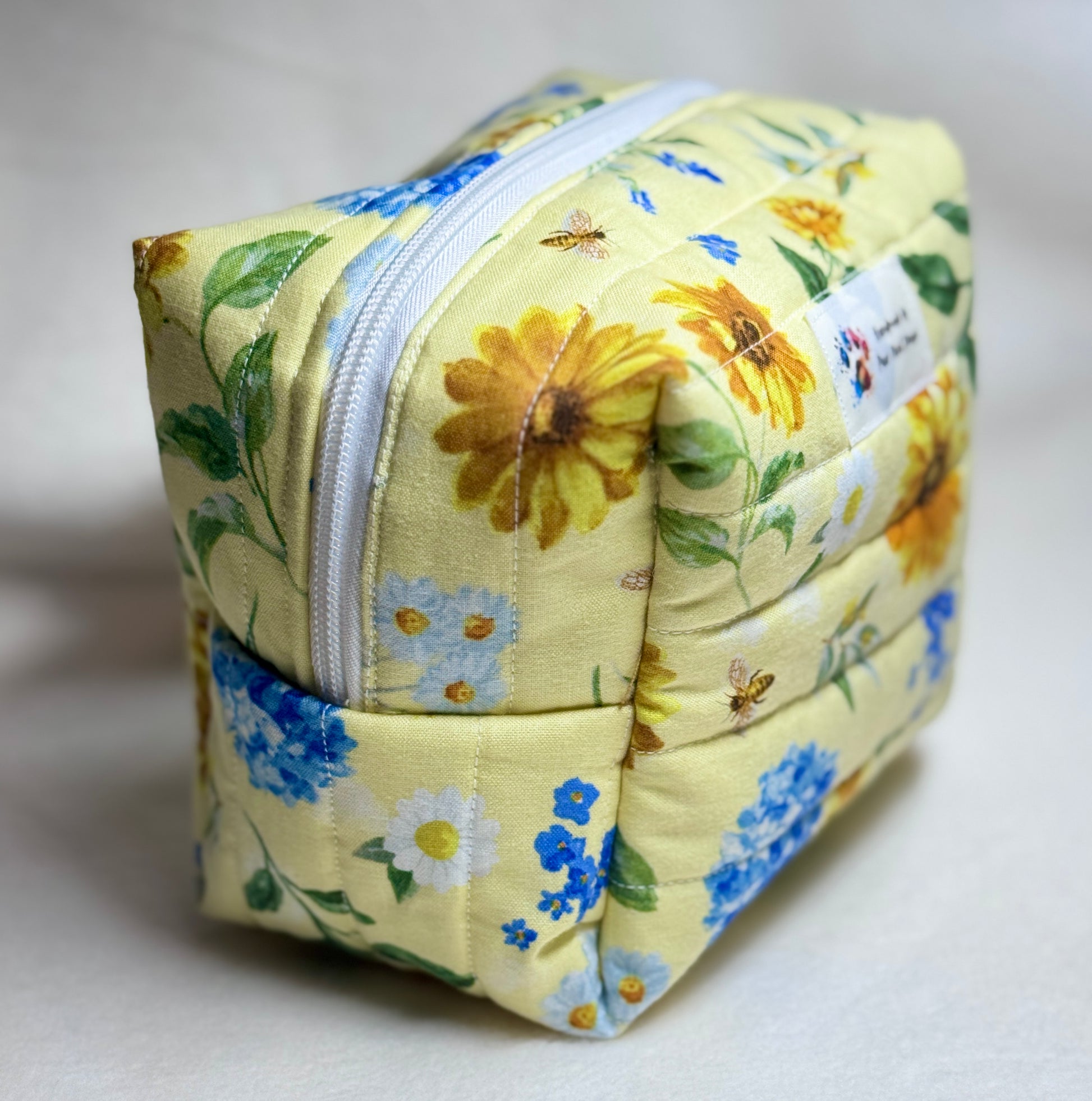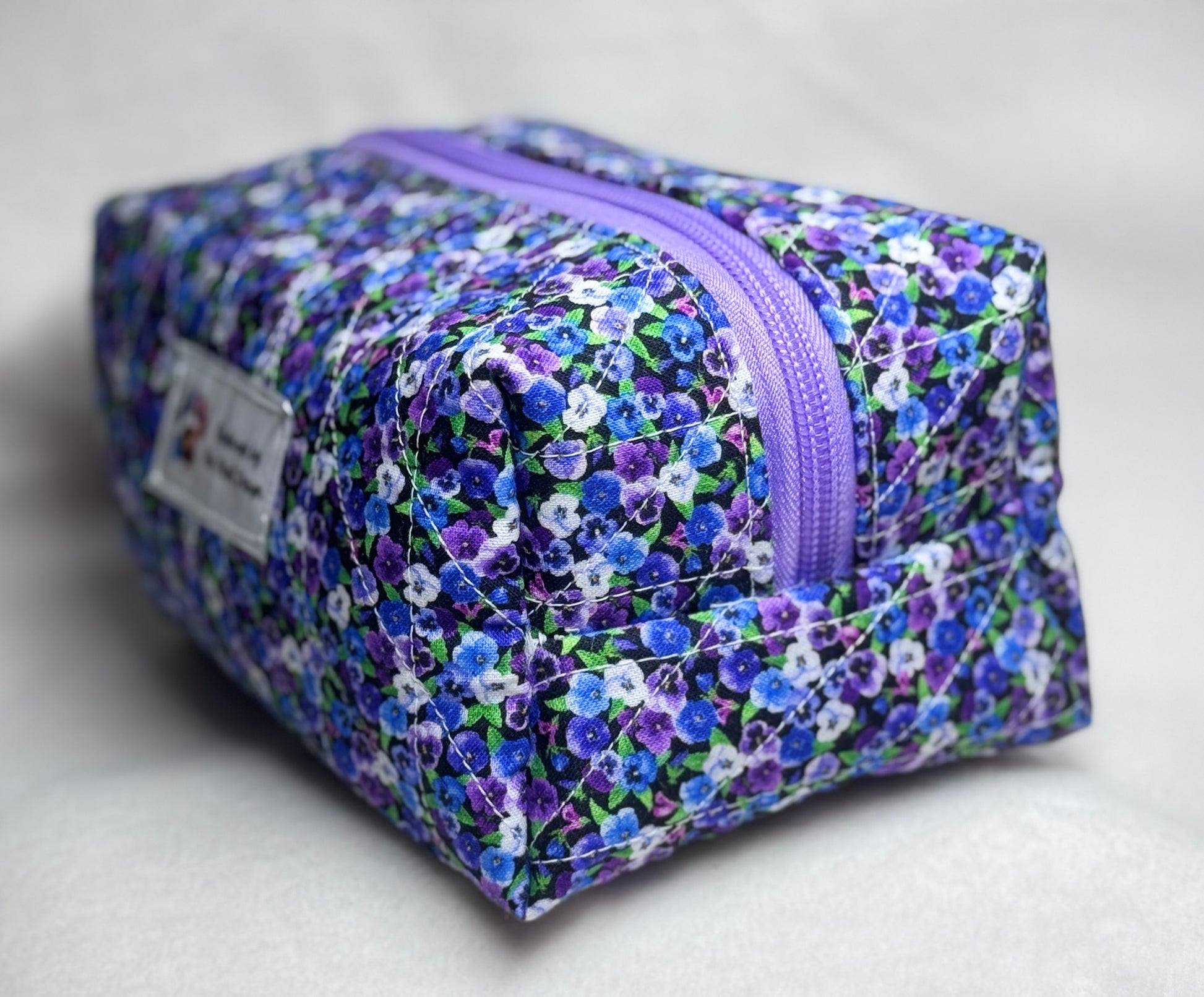 Keep your beauty essentials beautifully organized with this handmade quilted makeup bag. Sized at 7" long x 5" wide x 5.5" high, this roomy bag is perfect for cosmetics, toiletries, travel accessories, or crafting tools.