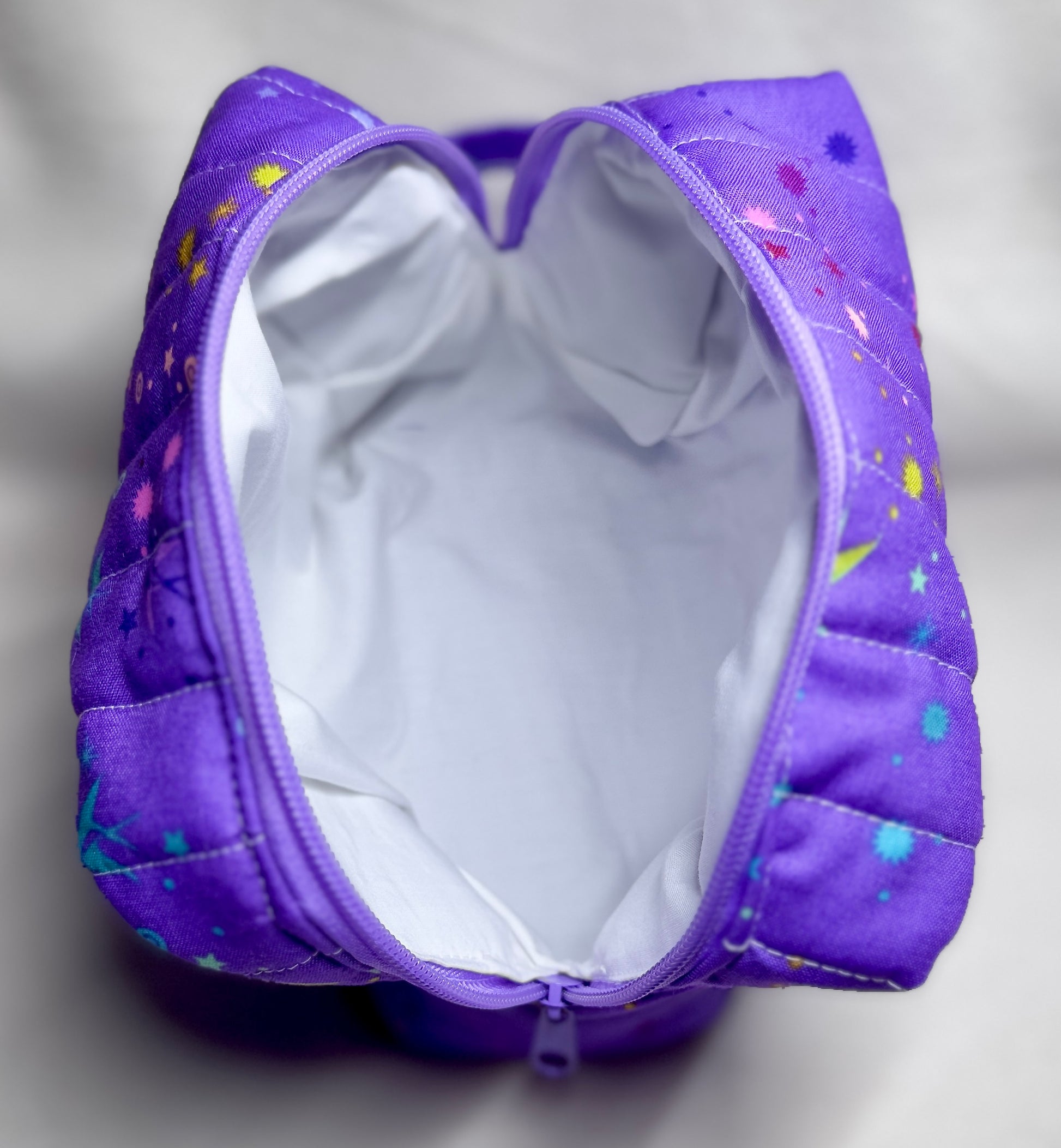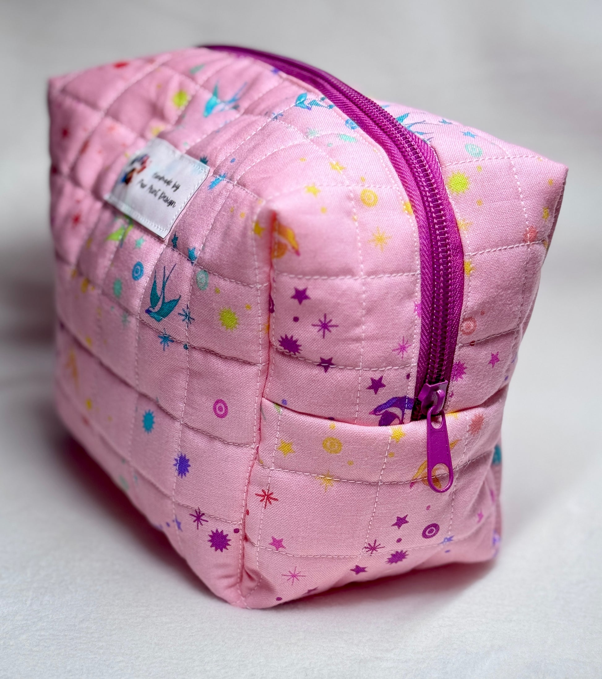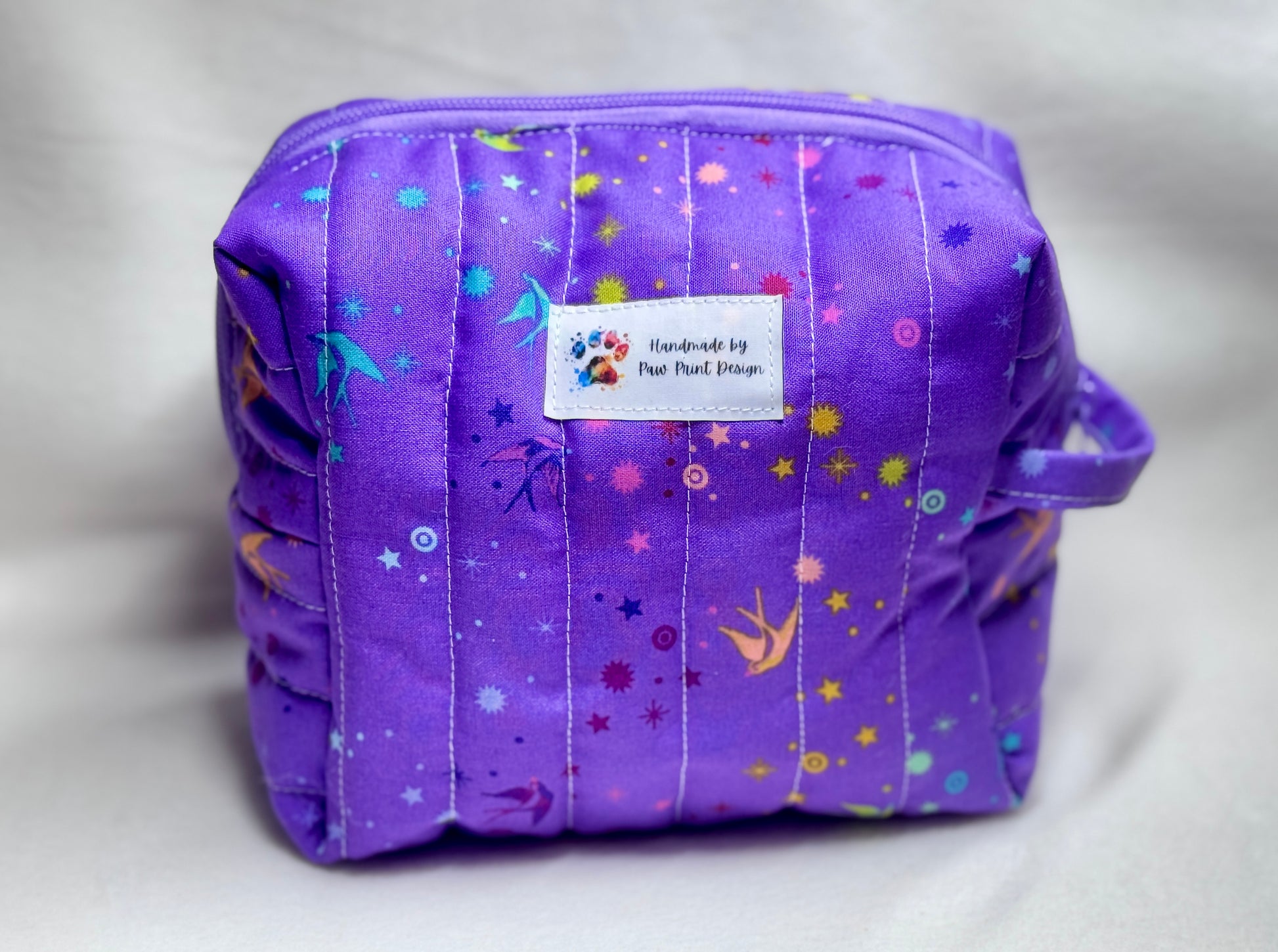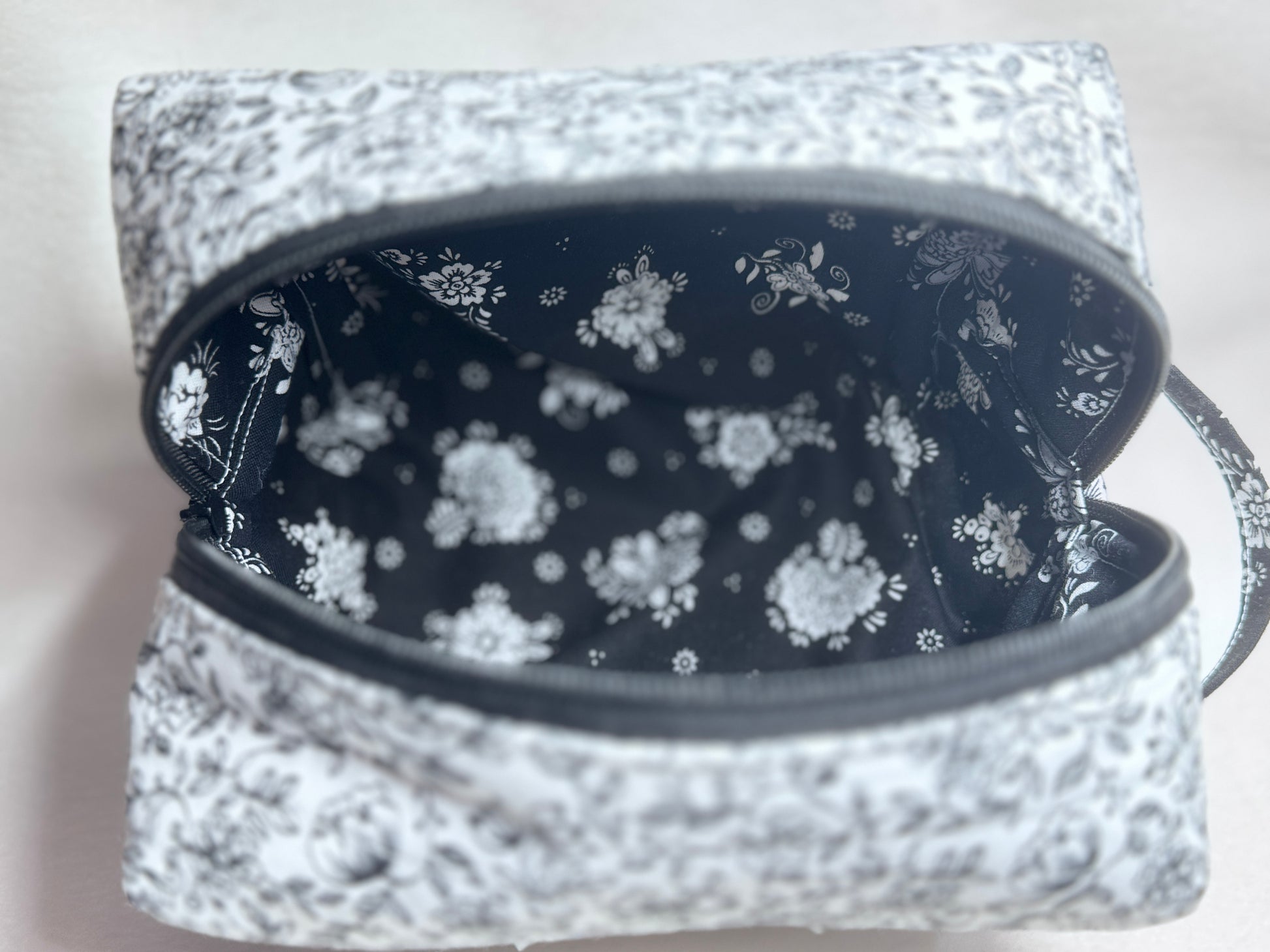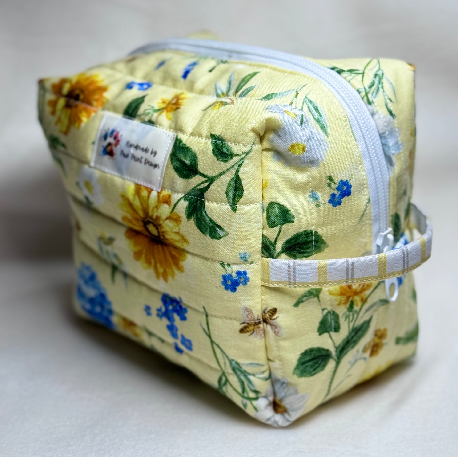 Keep your beauty essentials beautifully organized with this handmade quilted makeup bag. Sized at 7" long x 5" wide x 5.5" high, this roomy bag is perfect for cosmetics, toiletries, travel accessories, or crafting tools.